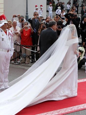 Выходя замуж, герцогиня Шарлен решила доверить разработку платья своему давнему другу-дизайнеру Джорджо Армани. С этим выбором она точно не прогадала. Дизайнер создал для нее роскошный образ с пятиметровым шлейфом и вышивкой из жемчуга.