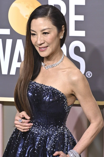 Марафон премий Мишель Йео за фильм «Все везде и сразу» в 2023 году по блистательности сравнится только с ее выходами на красную дорожку. Одним из самых эффектных образов за это время стало, без сомнения, мерцающее платье Armani Privé, который она надела на церемонию вручения премии «Золотой глобус». Великолепный темно-синий наряд с пайетками, прямой длинной юбкой и баской на талии произвел фурор — тогда его обсуждали многие модные СМИ.