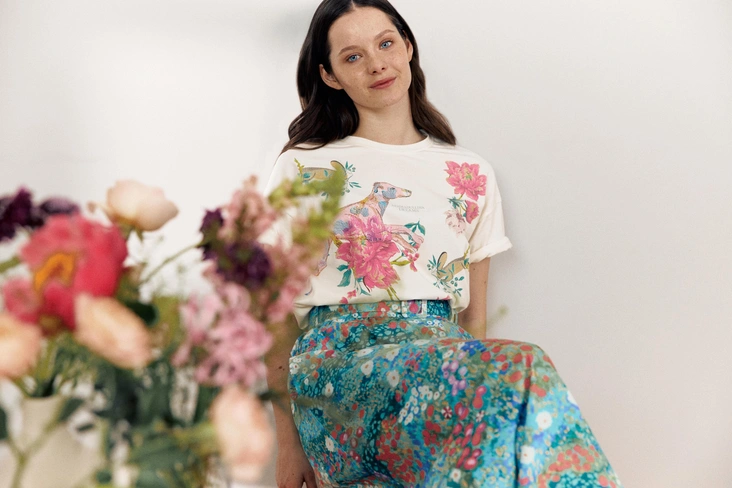 Принт с костюма Забавы был адаптирован в дизайн-студии Akhmadullina Dreams и нанесен на футболку и шопер — неизменные бестселлеры бренда, которые будут каждый день напоминать своим обладательницам о том, что сказка об исполнении мечты может стать самой настоящей реальностью.