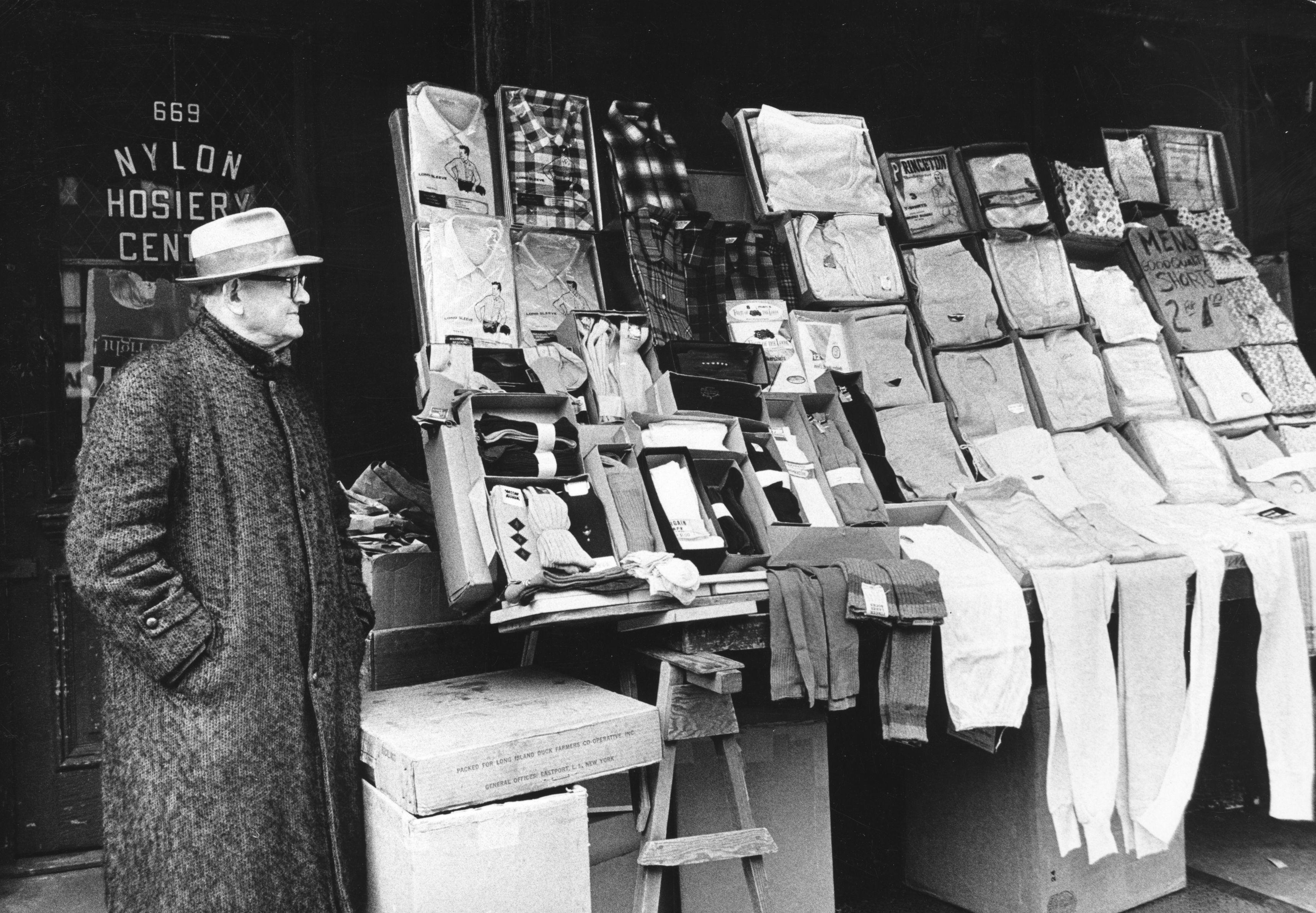 Около 1960-го года: распродажа вещей из нейлона и других синтетических материалов.