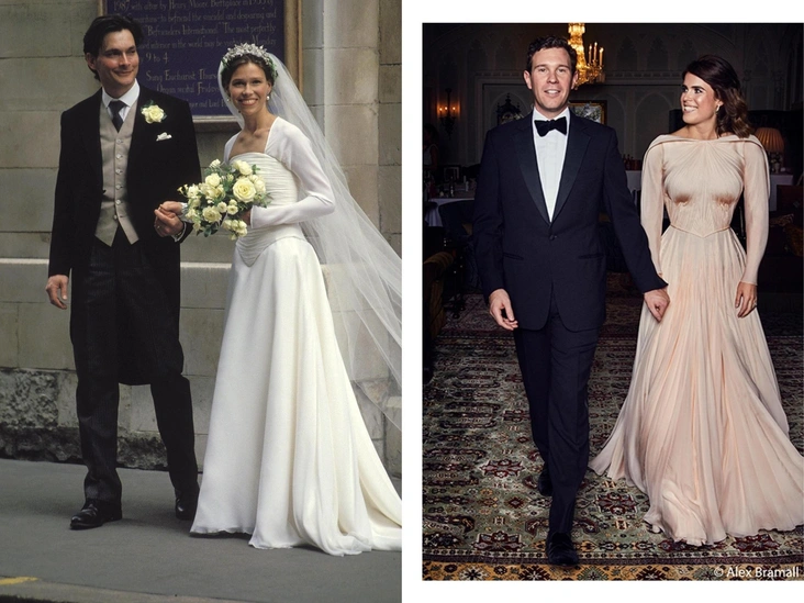 Принцесса Евгения попадает во вторую категорию, ведь Йоркская шла под венец впервые. Наследница была в белом платье в Вестминстерском аббатстве, а для более неформальной части предпочла бежевое от Зака Позена.