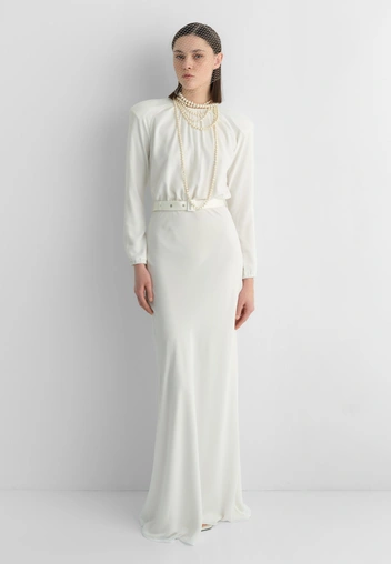 Тренд на сексуальность и открытые образы виден невооруженным глазом. Но, как бы парадоксально это ни было, мы видим также тенденцию прикрывать свое тело и выглядеть более сдержанно. То же касается и свадебного образа, так что вместо классического V-образного выреза в 2025 году можно посмотреть на удлиненный ворот в стиле водолазки.