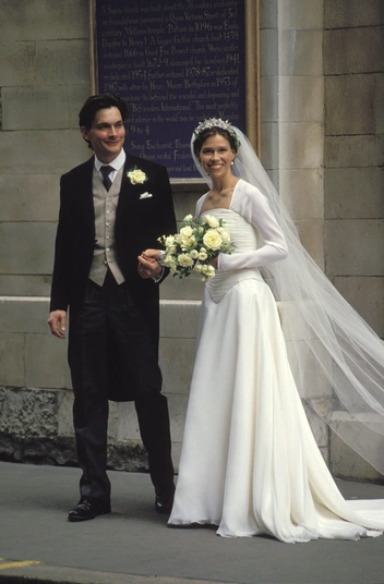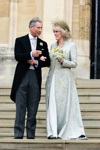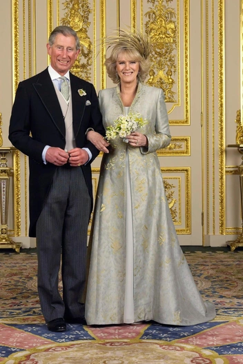 Выбор не белого цвета для свадьбы вполне понятен: многие выходят замуж не впервые, поэтому не хотят придерживаться этой традиции, а кто-то просто решает разбавить привычную светлую гамму. Камилла Паркер-Боулз попадает в первую категорию — до того, как выйти замуж за наследника престола и своего давнего любовника, она уже была в браке с Эндрю Паркер-Боулзом, а потому выбрала нежно-голубое платье с золотыми вкраплениями от Анны Валентайн.