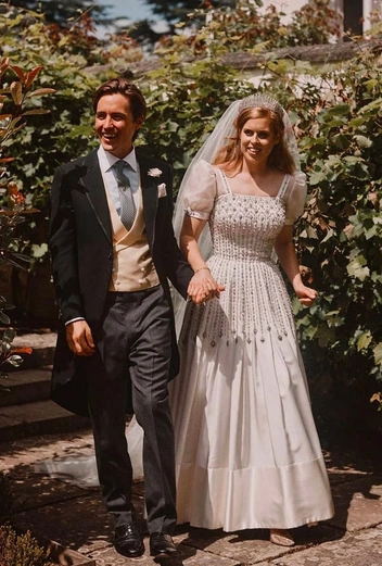 Лук принцессы Беатрис лучше всего показывает, как сильно поменялась мода на свадебные платья. Если раньше они должны были содержать длинный подол и необъятную фату, то сейчас достаточно выйти в вечернем наряде. Что и сделала Йоркская: она попросила платье у своей бабушки Елизаветы II, которое та надевала на мероприятия после 5 o’clock tea. Ручная работа со стразами смотрится роскошно и намекает на модный сейчас стиль бохо, а рукава буфы — это еще один тренд 2025 года.