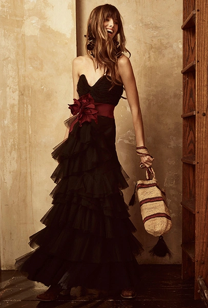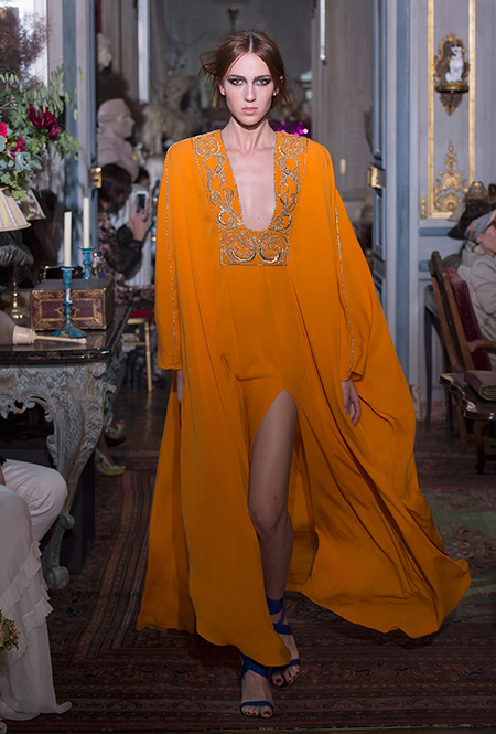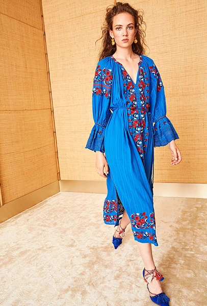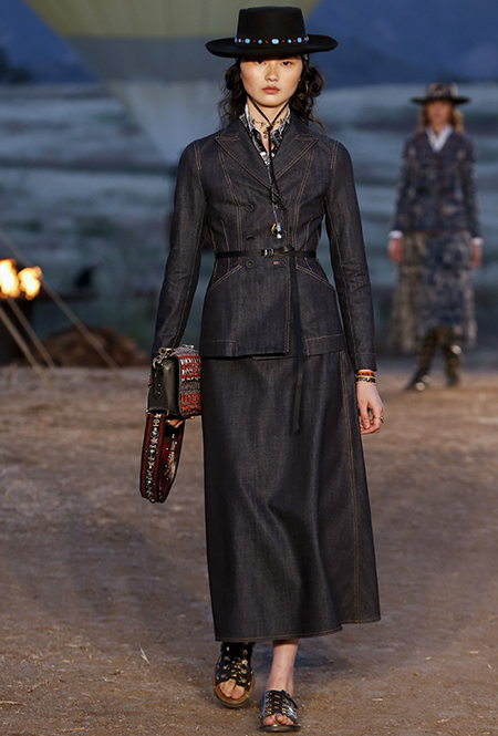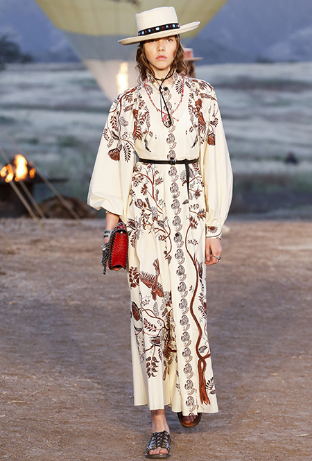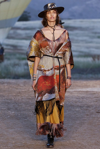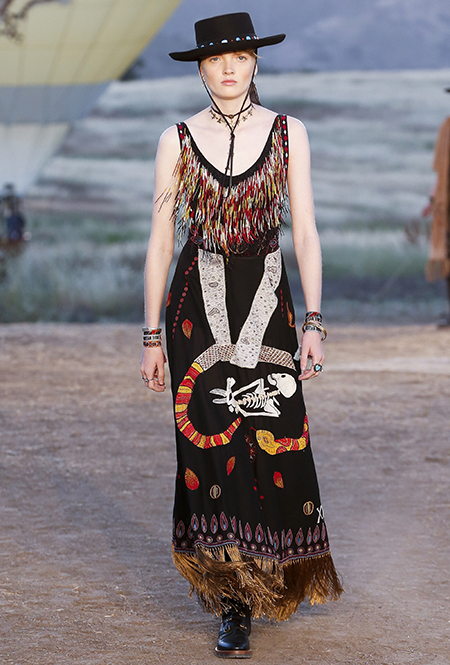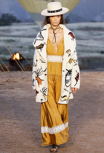 Если же морская пена все еще за горизонтом, можно вспомнить «Сказку странствий». Такое ощущение, что дизайнеры вдохновлялись всей планетой сразу: здесь и индейские племена, и Тибет, и Восток, и Азия, и даже Украина. Иногда цитата угадывается с первого взгляда, иногда выглядит как тонкий намек — как платье из коллекции Николя Жескьера, в котором я вижу сошедшую с костра под ночным синим небом Жанну Д’Арк.