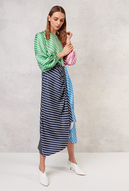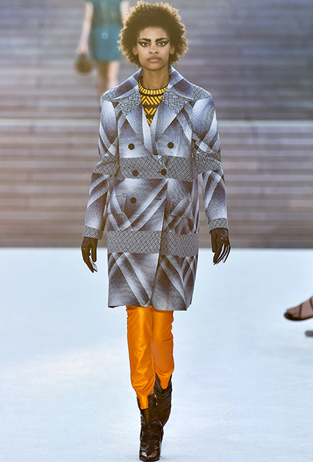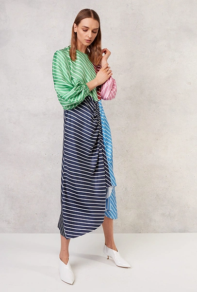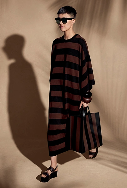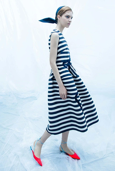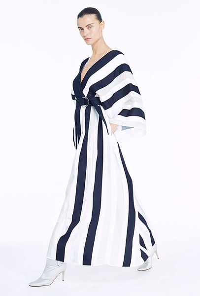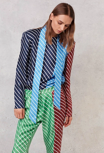 Полоска тоже чрезвычайно разнообразна: вертикальная, горизонтальная, диагональная, широкая и узкая, двухцветная и почти радужная. Самый оригинальный способ — сочетание нескольких тканей в одном образе, но чаще всего в коллекциях мелькали длинные платья с лаконичной, но очень широкой полоской. Моя любимая вещь — объемный жакет Louis Vuitton, где цветная полоска «вмонтирована» в черно-белую гамму.
