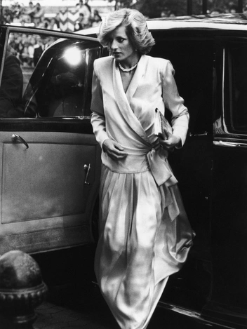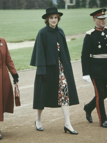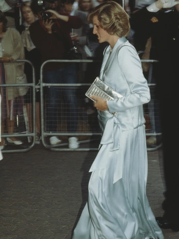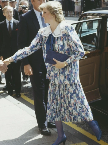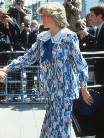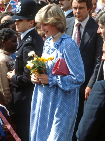 Один из самых «цитируемых» предметов гардероба принцессы Уэльской — ее голубое платье в белый горошек. Его Диана надевала несколько раз за свою первую беременность, в том числе и во время последнего официального выхода перед первыми родами (платье также путешествовало с Ди в Италию). Трогательные оборки на воротнике и манжетах неизменно дополнялись жемчужными украшениями. В этот раз пару наряду составили розовые туфли и клатч того же цвета. Автор платья — Catherine Walker, один из любимых дизайнеров Ее Высочества.