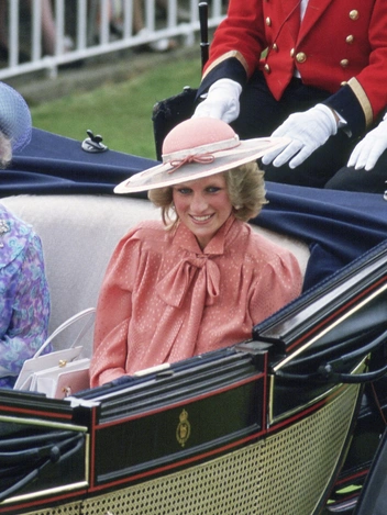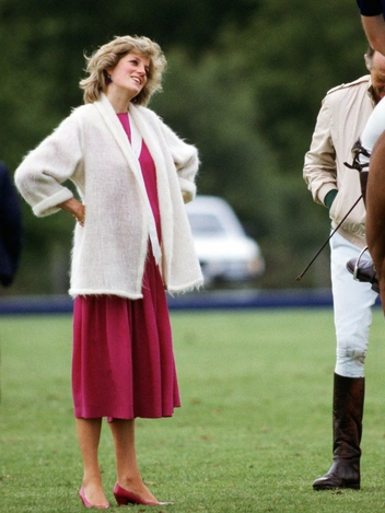 Разнообразные вариации воротников — одна из визитных карточек Дианы образца 1980-х. В розовом платье с матросским воротником Ее Величество видели как минимум дважды: на официальных фотографиях Уэльских, сделанных на скамейке в саду Кенсингтонского дворца (тогда Ди была на шестом месяце беременности), а еще на матче по поло, когда принцесса дополнила наряд пушистым белым кардиганом.