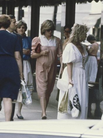 Принцесса никогда не пренебрегала радостями шоппинга, и во время первой беременности была запечатлена во время похода в универмаг Harrods. Для этой вылазки Диана выбрала хлопковое платье в мелкую красную полоску. Объемные рукава и необычное оформление воротника сделали его по-настоящему стильным. Картину довершили крупные солнечные очки и темно-красная сумка под мышкой.