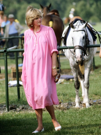 В последние недели ожидания принца Уильяма принцесса наконец почувствовала себя расслабленно. В теплый летний день она отдала предпочтение свободному розовому платью-рубашке, светлой обуви и очкам-авиаторам. В таком виде Диана отправилась понаблюдать, как ее муж играет в поло в Виндзоре.