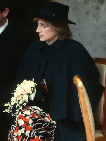 На этих снимках Ее Высочество запечатлена на ранних сроках первой беременности. Тем не менее, Ди уже успела перейти на вещи для будущих мам. Под темно-зеленым пальто необычного кроя скрывается платье Donald Campbell с активным принтом. Ансабль дополнен черной шляпой с прямыми полями, белоснежными колготками и туфлями на низком каблуке. В таком виде принцесса прибыла в Честерфилд.