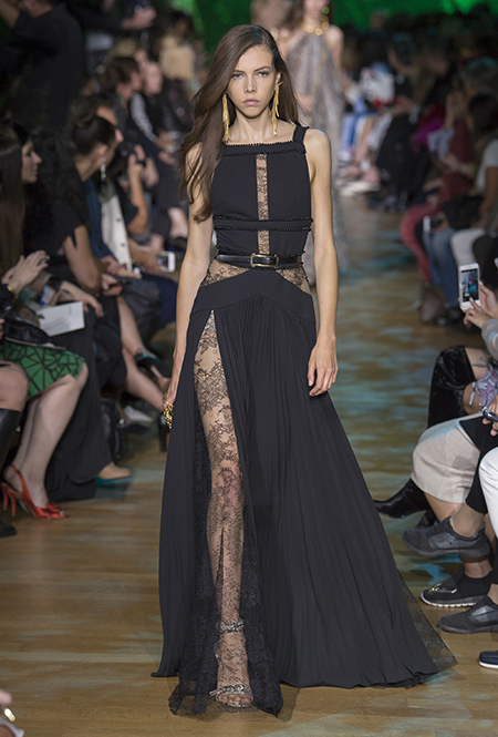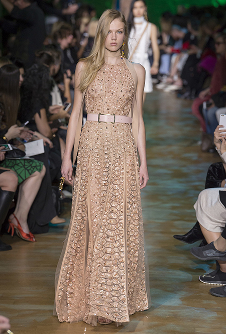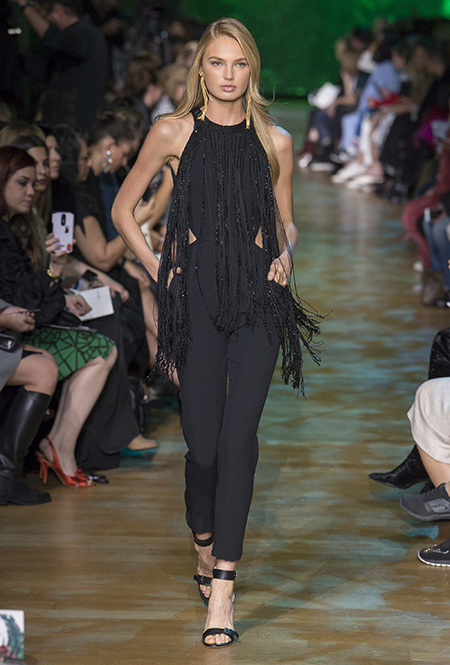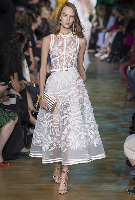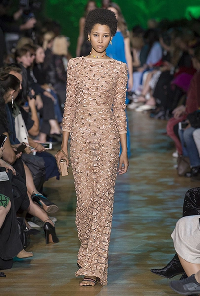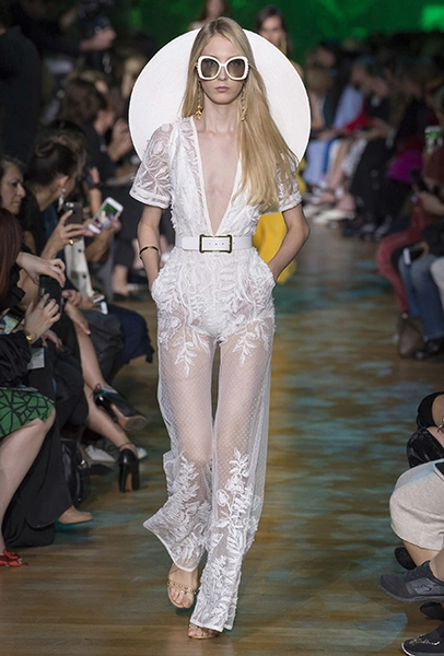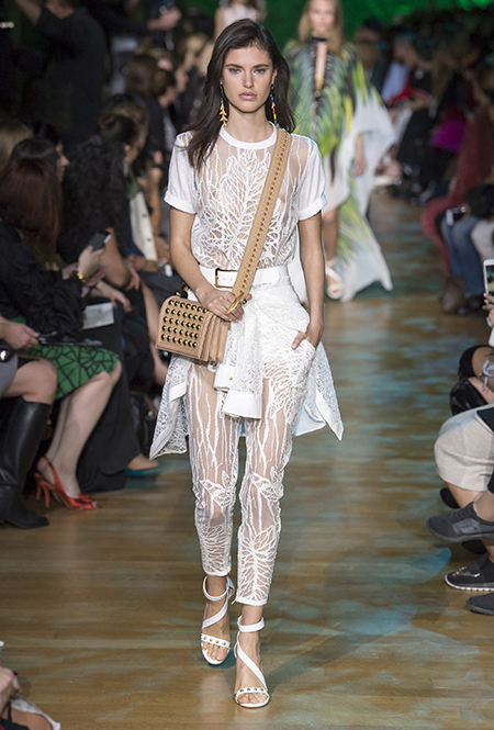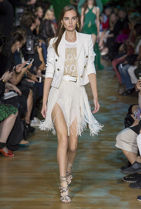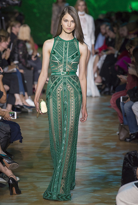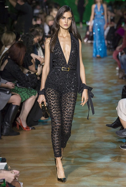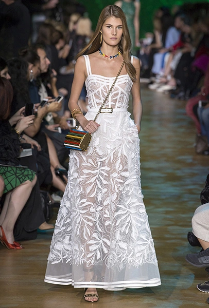 Новая коллекция дизайнера, привыкшего воспевать шик, блеск и роскошь, неожиданно посвящена путешествию в джунгли Амазонки. Но, нет, разумеется, добротных вещей в практичном стиле «сафари», вы у Сааба не найдете. У него как обычно очень мало daywear – разве что, например, строгий белоснежный комбинезон с низким вырезом и блестящими пуговицами, или такого же цвета жакет, наброшенный поверх минималистичного платья с ремнем. Если в этих вещах и можно покорять джунгли, то только городские. Впрочем, наверняка успешно.