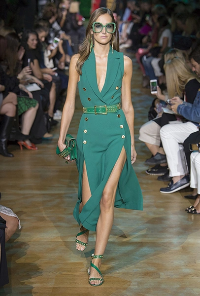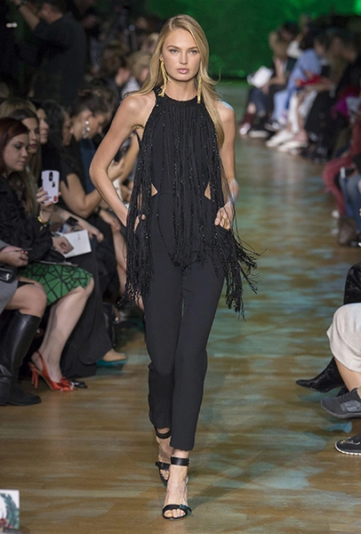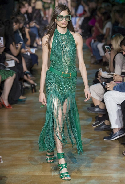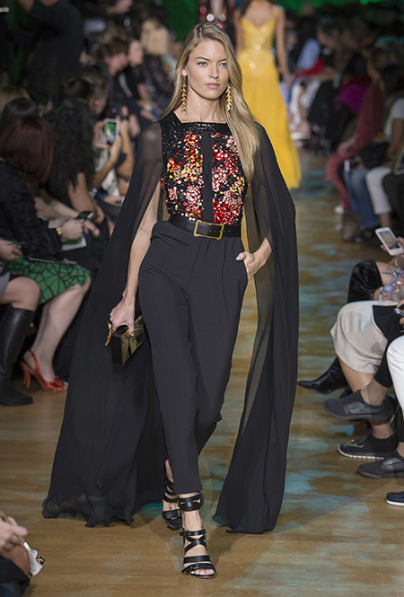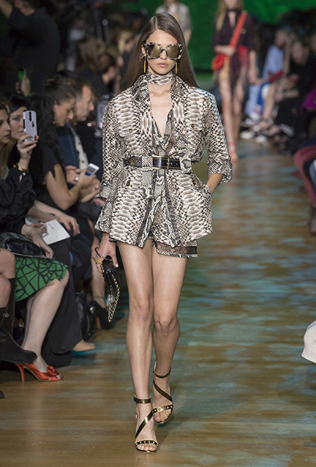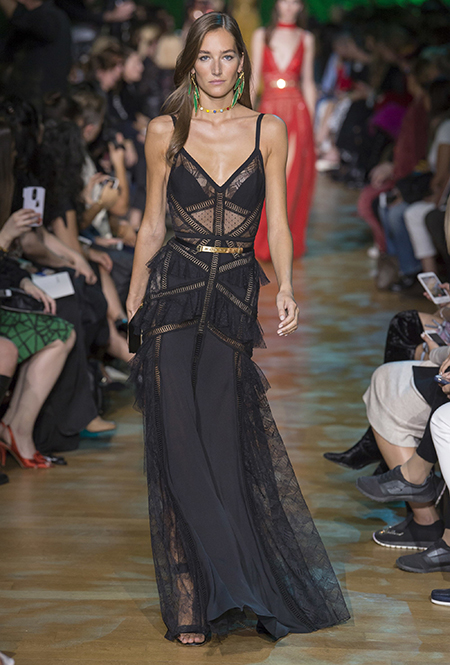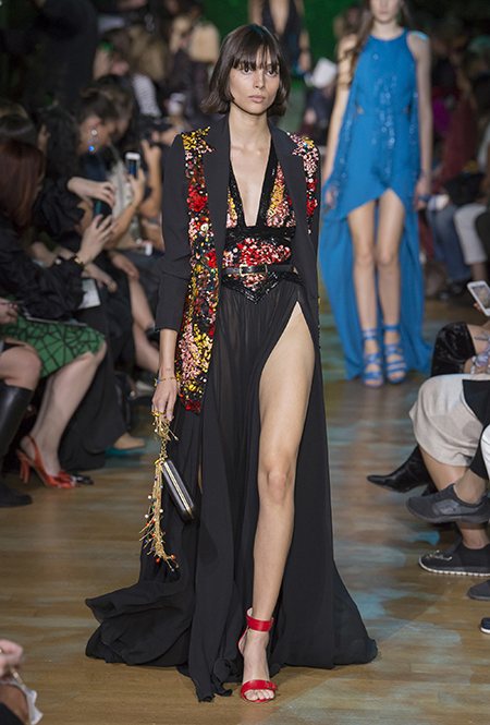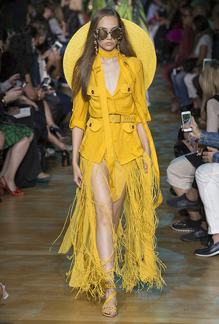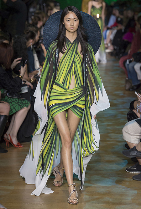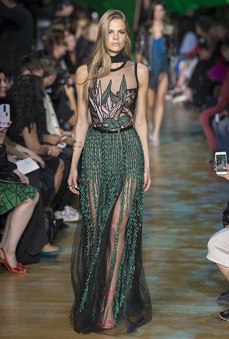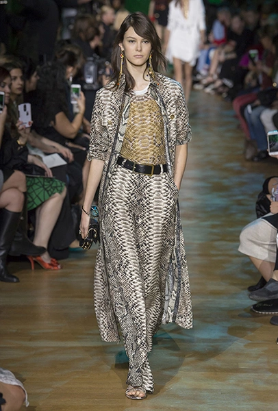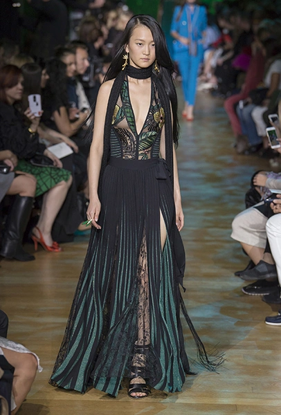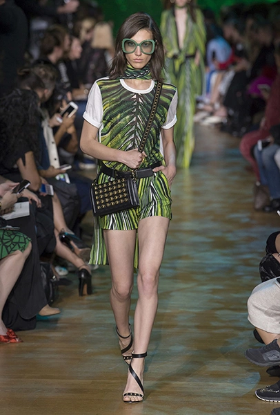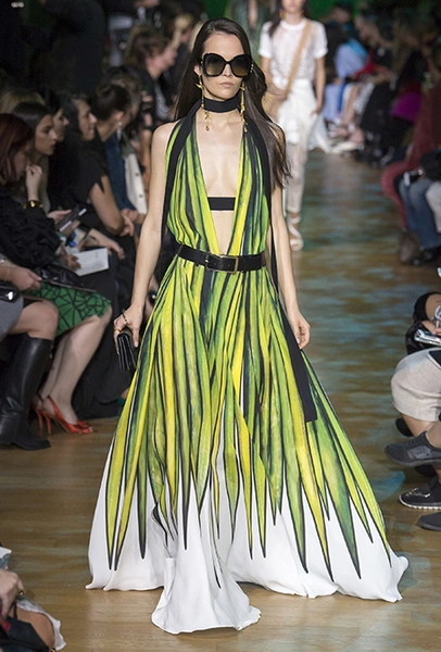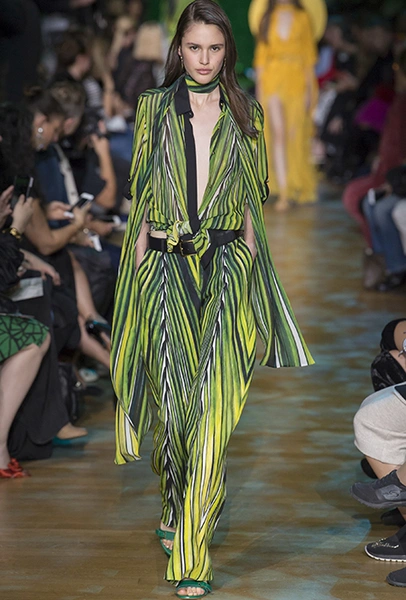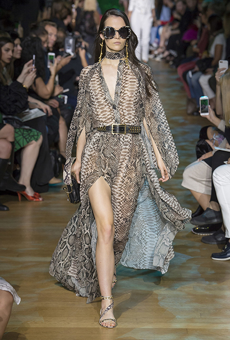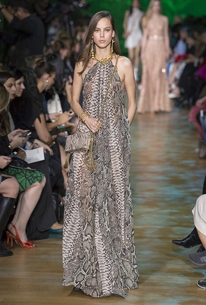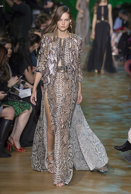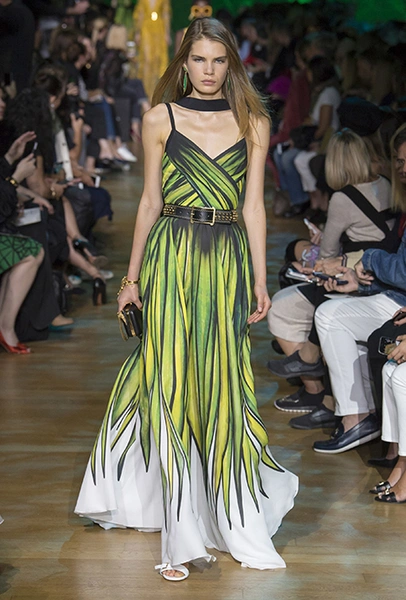 В остальном коллекция по-Саабовски роскошна и гламурна. К теме тропической природы отсылает обилие принтов «под питона». Ими покрыты очень разноплановые вещи – от пальто до длинного вечернего платья с оборками. Рисунки в виде больших, заостренных ярко-зеленых листьев украшают полупрозрачные лифы длинных платьев. Близкие по стилю принты только ярче, в стиле поп-арта, покрывают шорты, комбинезон и… другие платья в пол, делая моделей похожими на туземок, которым листья заменяют одежду. Тут и там мелькают всполохи кроваво-красного, который иногда плавно переходит в розовый, а иногда остается однотонным. Видимо, он призван вызывать ассоциации с закатом в джунглях или с яркими тропическими цветами.