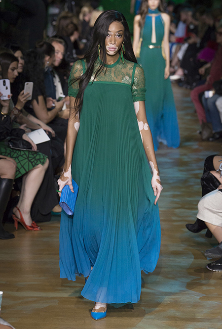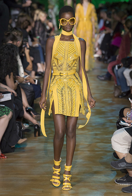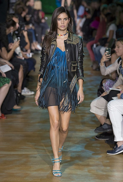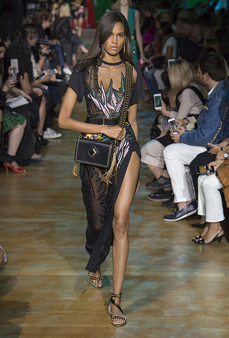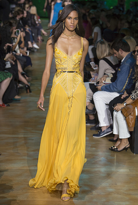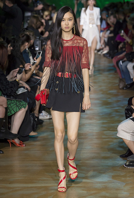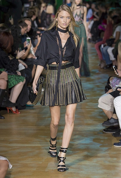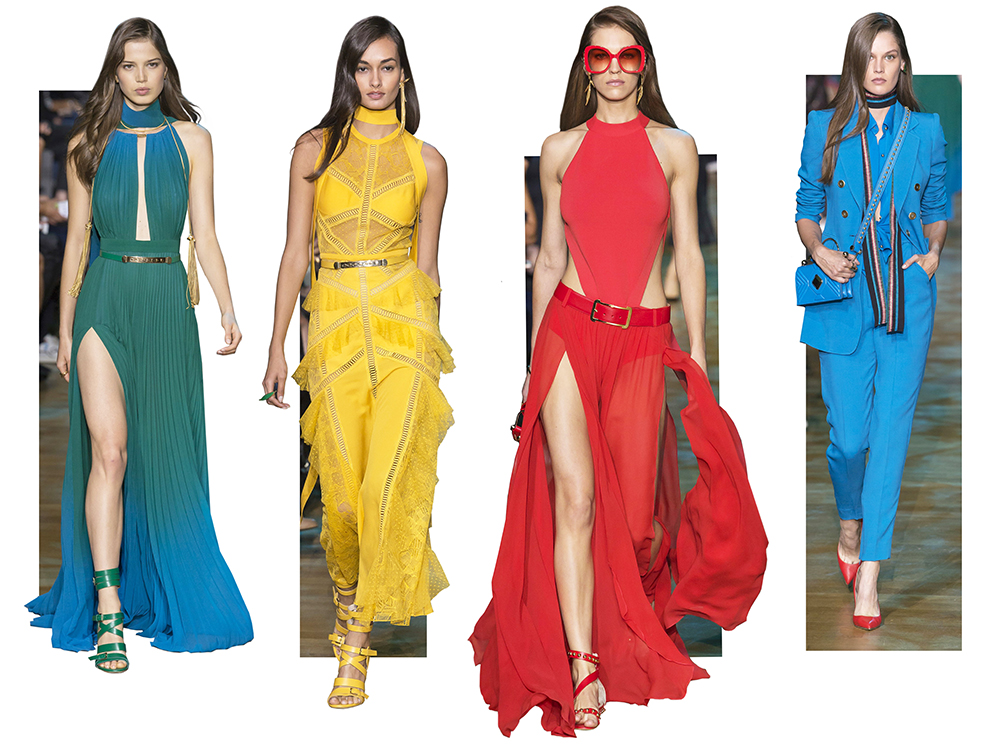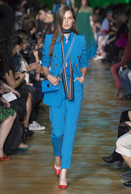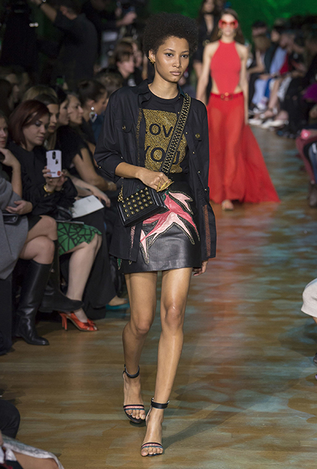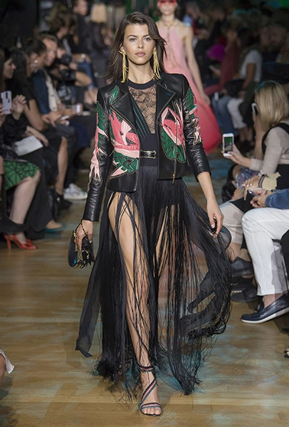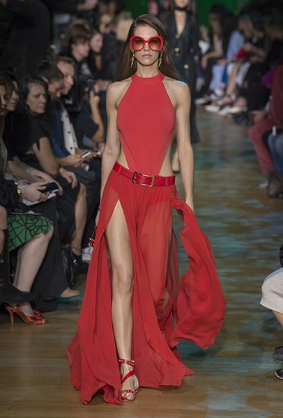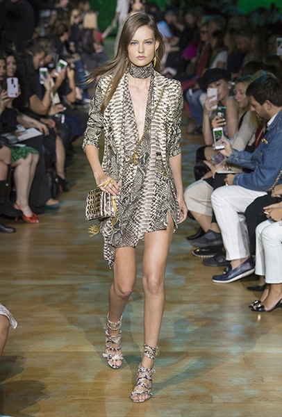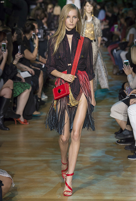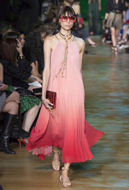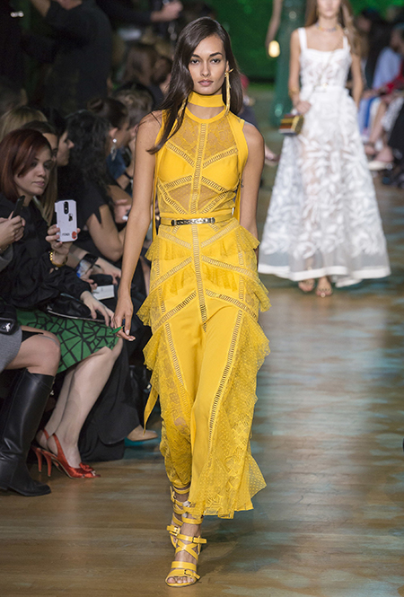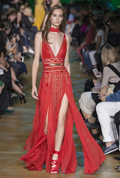 В остальном коллекция по-Саабовски роскошна и гламурна. К теме тропической природы отсылает обилие принтов «под питона». Ими покрыты очень разноплановые вещи – от пальто до длинного вечернего платья с оборками. Рисунки в виде больших, заостренных ярко-зеленых листьев украшают полупрозрачные лифы длинных платьев. Близкие по стилю принты только ярче, в стиле поп-арта, покрывают шорты, комбинезон и… другие платья в пол, делая моделей похожими на туземок, которым листья заменяют одежду. Тут и там мелькают всполохи кроваво-красного, который иногда плавно переходит в розовый, а иногда остается однотонным. Видимо, он призван вызывать ассоциации с закатом в джунглях или с яркими тропическими цветами.