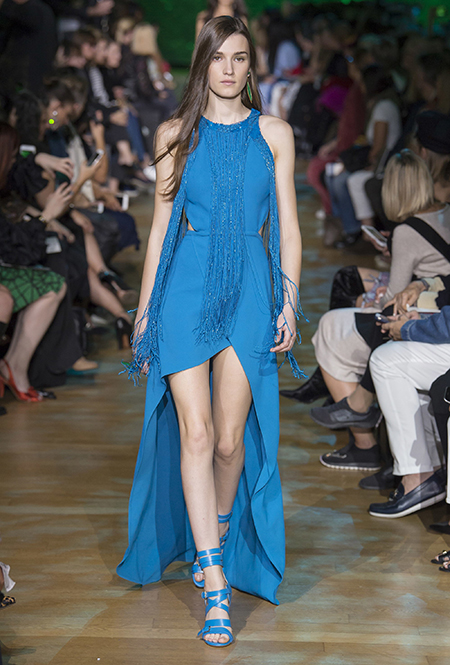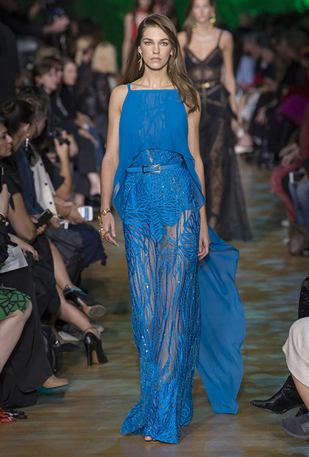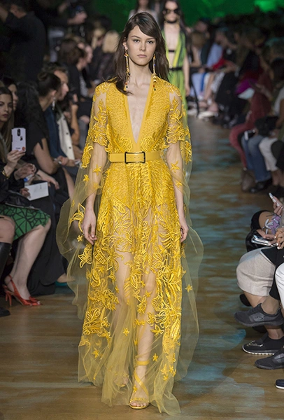 Цвет вообще главное в этой коллекции. Здесь нашлось место и ярко-желтым кружеву и коже. И муслину цвета припыленной июльской листвы. Но эффектнее всего у Сааба выходит насыщенный, без примесей, ярко-голубой. Наверное, так же ослепительно выглядит для исследователя джунглей небо, проблески которого виднеются свозь ветви и гигантскую листву. На некоторых вещах голубой плавно переходит в зеленый, а чтобы глаз не устал от всех этих цветовых игр, Сааб добавляет в коллекцию бок из кремово-бежевых (некоторые, впрочем, усеяны стразами) и белоснежных графичных платьев. Последние наверняка придутся по вкусу будущим невестам.