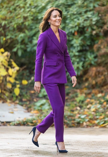 Главной поклонницей ярких оттенков в королевской семье была Елизавета II — бледную гамму на ней можно было заметить крайне редко. Не сказать, что Кейт полностью переняла эту любовь ко всем цветам радуги, но в ее выходах частенько наблюдаем любимый оттенок electric blue, а также фиолетовый — оба являются символом королевской власти и привилегированности, так что намек понятен.