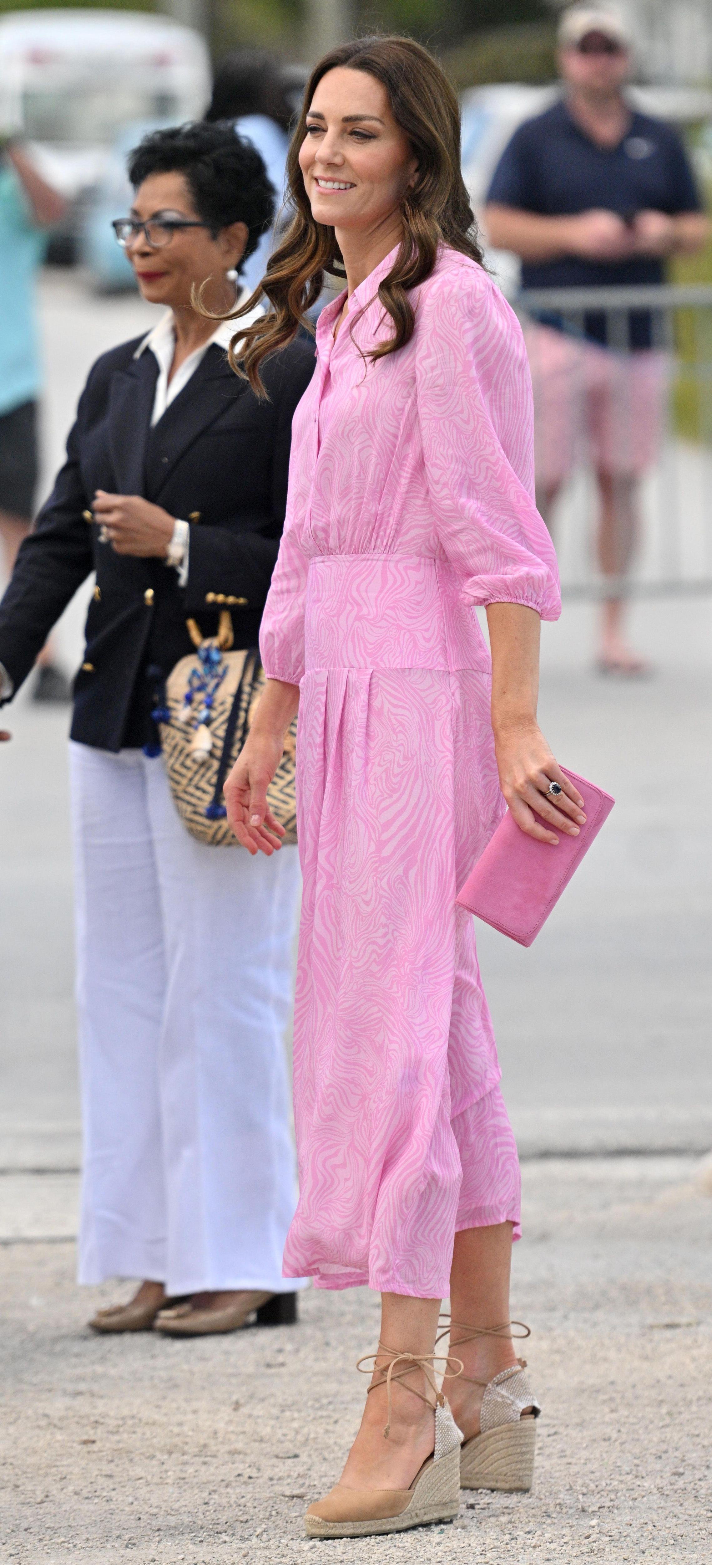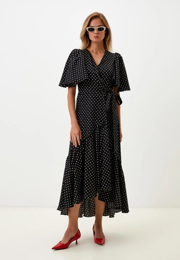 В арсенале будущей британской королевы видим разные интерпретации платьев в горошек: белое с высоким вырезом и драпировкой, черное с неожиданным разрезом и наше любимое темно-синее с V-образным вырезом. Надеваем с туфлями на заметном каблуке, чтобы не делать ноги более короткими — все-таки перед нами длина миди.