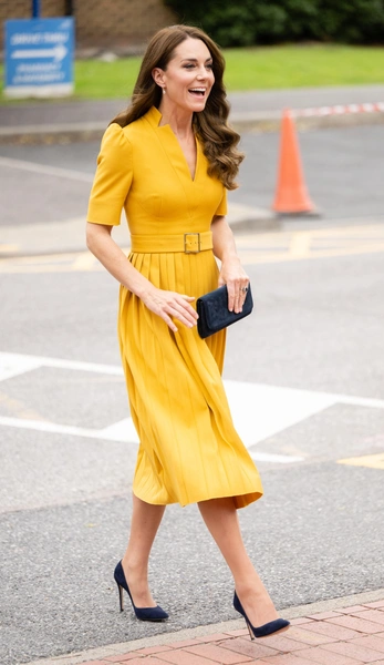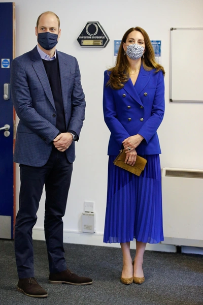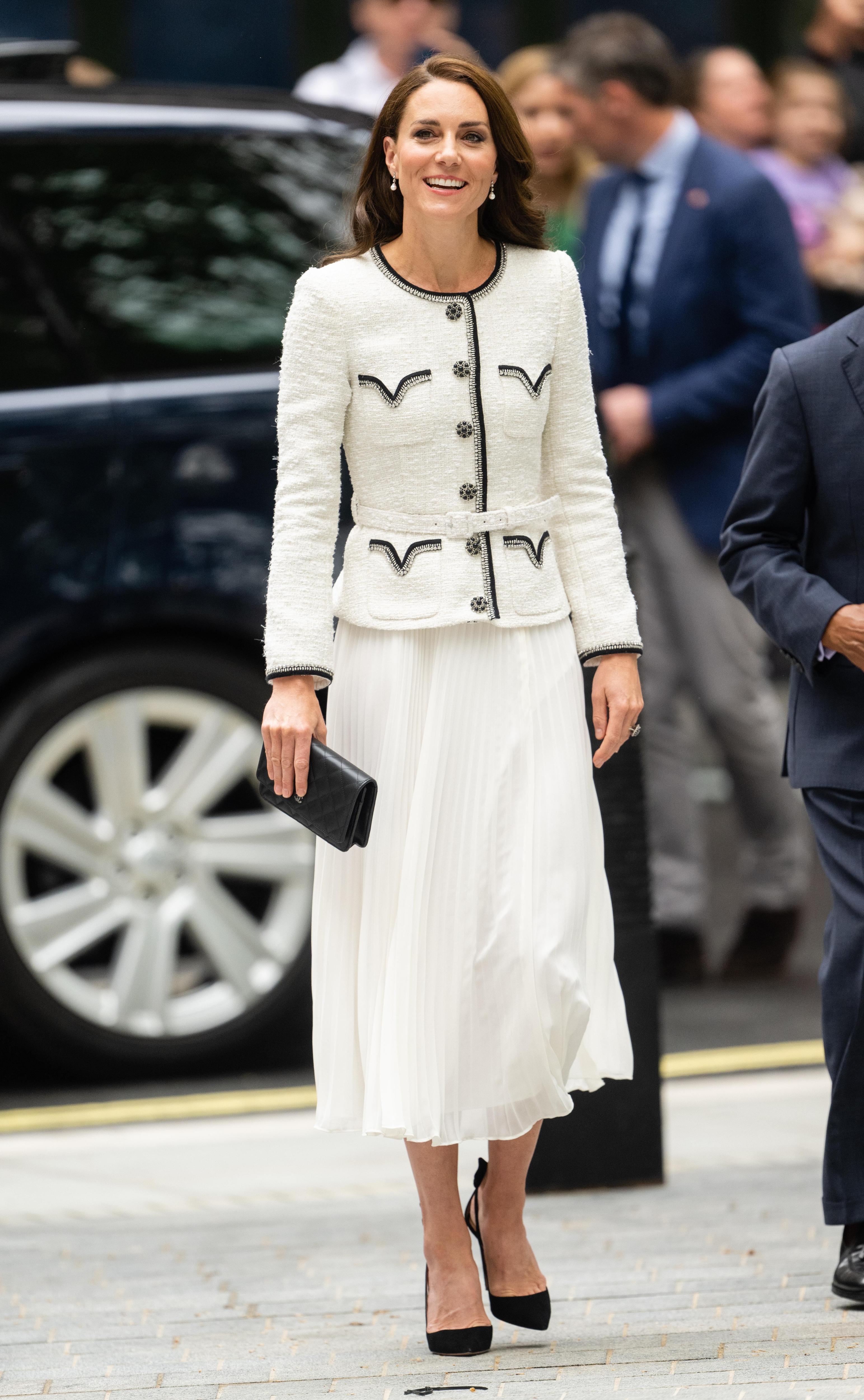 Британским налогоплательщикам лучше не знать, сколько комплектов от Self-Portrait есть в гардеробе принцессы Уэльской. Кейт обожает сочетание классического пиджака с поясом и плиссированной юбки — такая комбинация есть у принцессы, как минимум, в бежевом, белом и синем цвете. И не без причины — тут опять же видим грамотное расставление акцентов фигуры с помощью пояса, а еще плиссированная юбка всегда делает образ более «легким» и женственным.