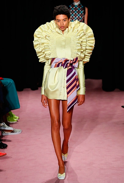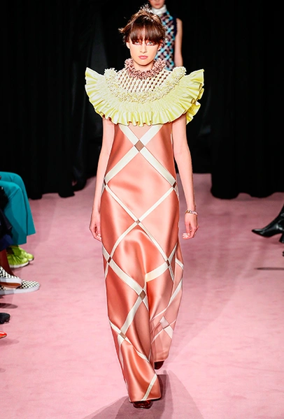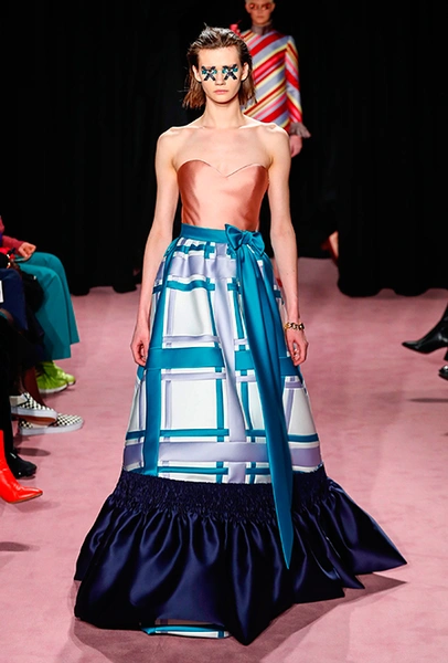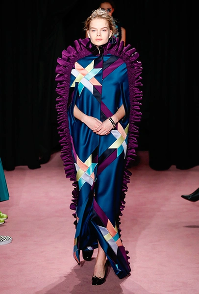 В этом сезоне творческому переосмыслению подлежал выбор ткани: вся коллекция Vikor & Rolf сшита из сатина-дюшеса. Само по себе это решение революционным не кажется: весенне-летняя коллекция 2014 года, получившей в западной прессе прозвище Van Gogh Girls, была целиком сшита из анкары. Преимущества сатина-дюшеса, однако, оказались весомыми: именно эта ткань, как объяснили дизайнеры за кулисами, позволила им вышивать и наносить принты так, как нужно им. Правда, натуральной ее не назвать: сатин-дюшес в новой коллекции бренда — не настоящий шелк, как может показаться, а его синтетическое подобие, которое Хорстингу и Снорену очень понравилось.