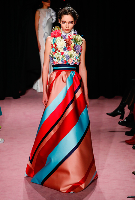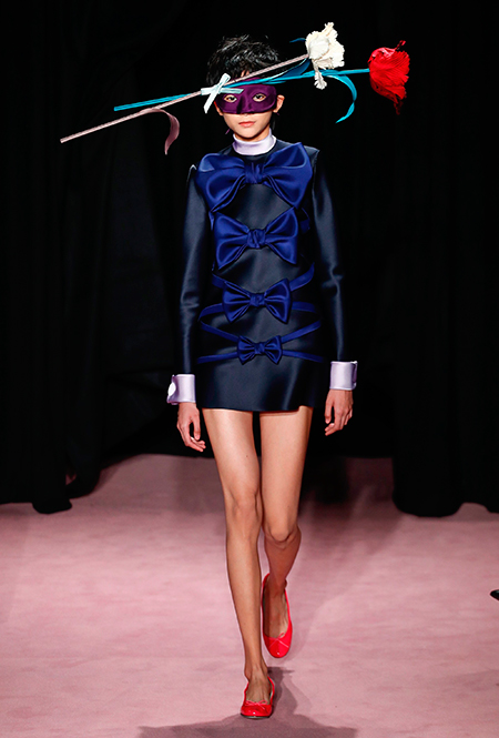Темой для декора платьев и аксессуаров стали цветы. Поистине, саундтреком всей кутюрной недели впору сделать знаменитый «Вальс цветов» из «Щелкунчика» Чайковского — так часто звучала цветочная тема на парижских подиумах. Хорстинг и Снорен подают ее максимально прямолинейно: на платьях распускаются ромашки, лилии и астры, а на масках селятся огромные срезанные розы. Флора на платьях сочетается с затейливой геометрией прямых линий и большими бантами.