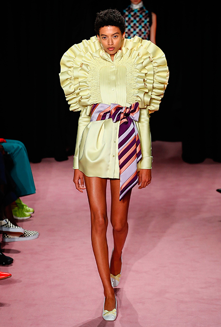 Довольно жесткая текстура сатина-дюшеса действительно помогает воплотить любые замыслы. Экспериментируя с его плотностью, дизайнеры добиваются любых силуэтов — от плавных и мягких до строгих и графичных. Во многом благодаря этому решению коллекция изобилует и прямыми платьями разной длины, и пышными юбками в складках, но почти все они пригодны к носке — что, в общем-то, не совсем типично для работ голландского дуэта.