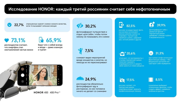 Согласно новому исследованию HONOR, 28,5% россиян не любят снимать себя из-за неуверенности в своей фотогеничности. Однако большинство продолжают фотографировать окружающее ради эмоций и воспоминаний. 22,7% опрошенных не удаляют даже снимки низкого качества, потому что ценят их как память. 73% респондентов берут смартфон везде, а 61% посещают локации ради фото. Почти 40% снимают себя в портретном режиме — он делает кадры выразительнее, но часто работает с ошибками. А зум и ночной режим разочаровывают каждого третьего.