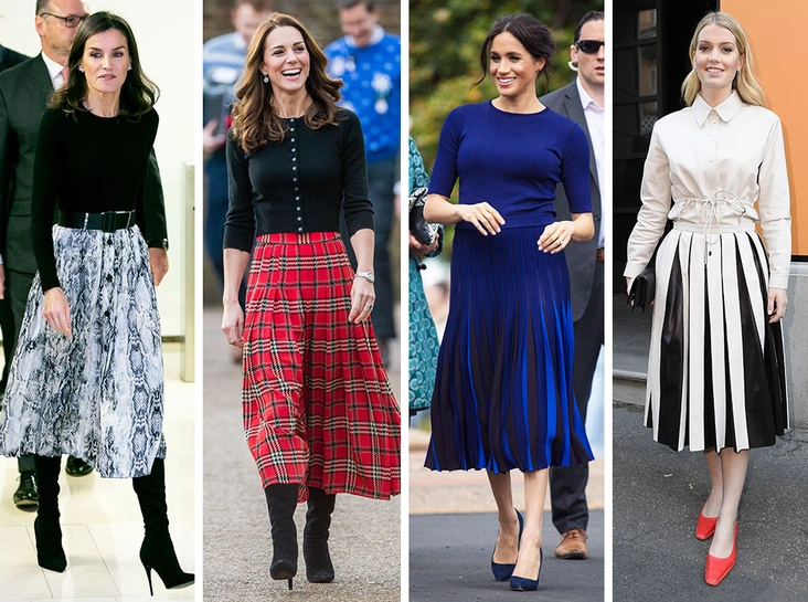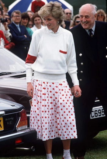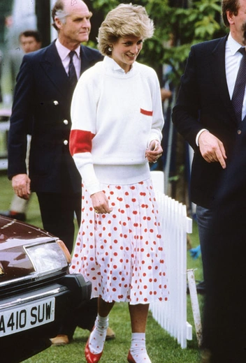 Преданная любовь королевских особ к плиссированными юбками-миди вовсе не является новой. Принцесса Диана также была поклонницей миди, в которых она появлялась не раз. Одним из самых запоминающихся образов Уэльской стал наряд с красно-белой юбкой миди в горошек, которую она носила на матче по поло в Виндзоре в 1986 году. Чтобы еще раз утвердить свой статус законодательницы трендов, Диана сочетала эту вещь с лодоками на низком каблуке, забавными носками с рисунком полька-дот и спортивным свитшотом.
