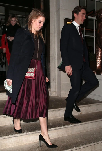 Мы уже выяснили, насколько универсальной может быть юбка плиссе для официальных мероприятий. Принцесса Беатрис решила пойти дальше и отправилась в ней на свидание со своим возлюбленным Эдоардо Мапелли Моцци. Для вечера с любимым девушка сделала выбор в пользу элегантной шелковой юбки в оттенке бордо, которую она сочетала с черным топом, удлиненным пальто и лодочками на шпильках.