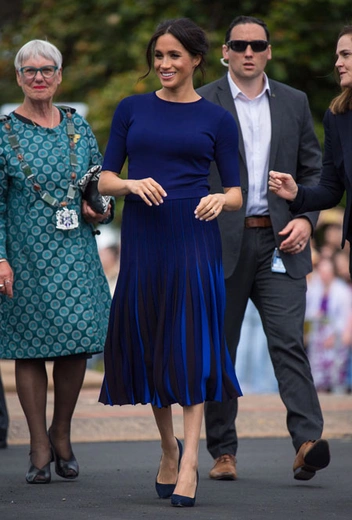 Не менее удачным выглядел образ Меган во время первого масштабного зарубежного тура по Австралии и Океании. Тогда, в заключительный день королевского турне, она представила ансамбль из джемпера и юбки плиссе от бренда Givenchy в своем любимом оттенке индиго.