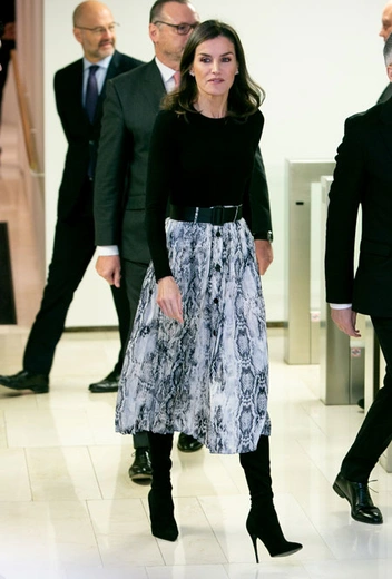 Испанская модница Летиция – главный амбассадор испанских масс-маркет брендов. И такая преданная любовь к недорогим вещам явно не имеет ничего общего с нехваткой средств. Королева с легкостью показывает. что варианты более бюджетной стоимости могут смотреться ничуть не хуже самых впечатляющих дизайнерских решений с подиумов. Поэтому и одним из ее самых любимых брендов давно стал лейбл Zara. Например, во время одного из официальных мероприятий Летиция показала образ с юбкой плиссе с животным принтом, которую она дополнила облегающим черным лонгсливом и высокими сапогами.