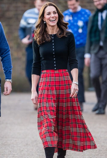 Кто сказал, что юбки плиссе подходят только для летних месяцев? В 2018 году герцогиня Кейт появилась в красной миди-юбке с принтом тартан, поддерживая рождественскую тематику. Супруга принца дополнила яркую вещь одного из ее самых любимых британских брендов Emilia Wickstead черными сапогами до колена и облегающим кашемировым кардиганом от Brora.