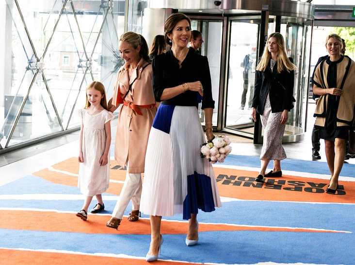 Мало того, что королевские особы обожают плиссированные юбки-миди, но, кажется, в королевских гардеробах европейских аристократок есть своя предпочтительная цветовая схема – черный, белый и синий. В 2018 году датская кронпринцесса Мэри прибыла на саммит моды в Копенгагене в плиссированной юбке с асимметричным рисунком, который по цветовой гамме выглядел крайне похожим на «уимблдонский» наряд Меган. Конечно, после появления Сассекской на турнире эксперты поспешили высказать свои домыслы - возможно, именно модная кронпринцесса Мэри и была вдохновением для супруги Гарри? (читайте также: Как Меган Маркл копирует стиль кронпринцессы Мэри (возможно, неосознанно))