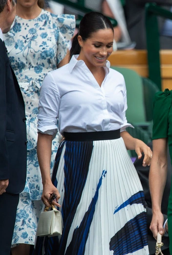 В июле 2019 года герцогиня Меган отправилась на турнир Уимблдона вместе с герцогиней Кембриджской и ее сестрой Пиппой и решила не лишать публику удовольствия полюбоваться на ее стильные наряды. Здесь она показала классический образ, построенный вокруг впечатляющей вещи от Hugo Boss. Плиссированная юбка миди имела красочные контрастные синие, белые и черные узоры, которые сделали эту вещь еще более необычной. К слову, вещи похожей тематики Меган полюбила давно – еще в 2018 году, сразу после нашумевшей свадьбы герцоги отправились на свадьбу, где Ее Высочество предстала в похожем образе.