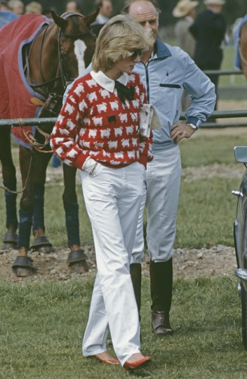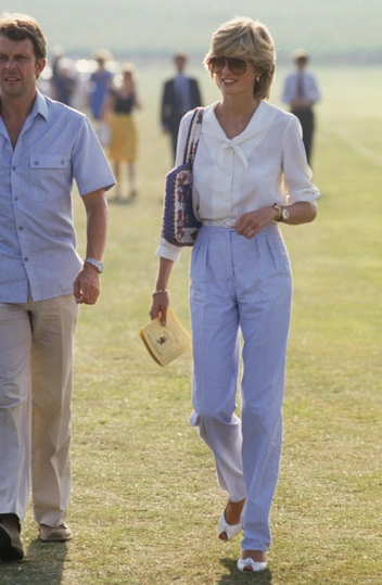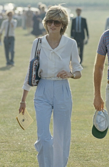 На вторую годовщину своей свадьбы в 1983 году Диана была сфотографирована в поло-клубе Cowdray Park в Западном Сассексе. Ее наряд выглядит как минимум на десять лет впереди своего времени; блузка с завязками на воротнике и широкие брюки в полоску сегодня по-прежнему считаются невероятно стильной классикой. Эпоху выдают только любимые солнцезащитные очки принцессы и узнаваемая стрижка.