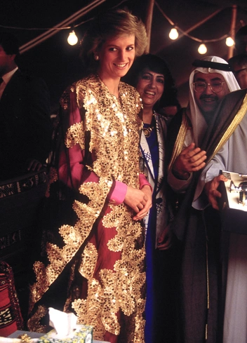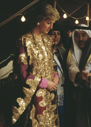 Одна из менее распространенных фотографий принцессы Дианы из ее поездки в Кувейт в 1989 году — кадр, где она носит традиционную бедуинскую джеллабу, расшитую золотыми блестками. Во время ее королевских туров на Ближний Восток она всегда выбирала драгоценные камни и яркие украшения (чокеры, бриллианты, золотые часы), которые бы отзывались в сердцах местных жителей и отлично передавали их наследие и традиции.