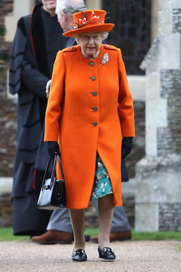 В тот год Елизавета решила отойти от традиционно красно-зеленых рождественских оттенков и выбрать не менее теплый апельсиновый. Королева предстала в оранжевом шерстяном пальто — воодушевляющем зимнем наряде, который отлично смотрится с темно-синим и черным, как доказывает Ее Величество.