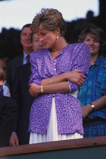 На женском финале Уимблдона 1991 года (к которому присоединился и девятилетний принц Уильям) принцесса Диана придерживалась белого дресс-кода Уимблдона, но выбрала сиреневый в качестве сопутствующего оттенка. К плиссированной юбке она решила добавить скромную принтованную блузу и пояс на талии — простой и изысканный наряд, который отлично подошел для мероприятия (читайте также: Спортивный интерес: самые стильные образы Дианы на Уимблдоне).