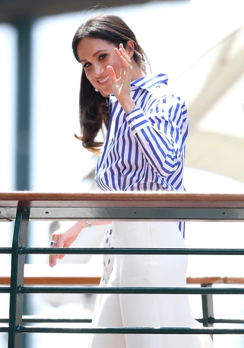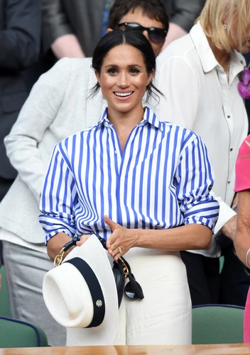 С первого года в королевской семье герцогиня Сассекская решила нарушать модные правила — эта участь коснулась и дресс-кода Уимблдонского турнира. Вместо скромного миди-платья, которые чаще выбирают многие другие VIP-персоны, герцогиня Сассекская заняла свое место в Королевской ложе, одетая в полосатую рубашку, заправленную в широкие белые брюки, и дополнила образ шляпой. Он выглядел сдержанно, но невероятно шикарно — именно то, что мы ожидаем от Ralph Lauren.
