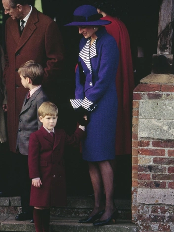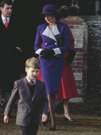 На Рождество во время традиционной службы в Сандрингеме принцесса Диана выглядела весьма ярко: ее пурпурное блейзерное платье 80-х годов с красочными полосатыми манжетами и лацканами создавало сказочный рождественский образ. Отдельного внимания заслуживают аксессуары — ее шляпа с перьями идеально сочеталась с черными перчатками и полупрозрачными колготками.