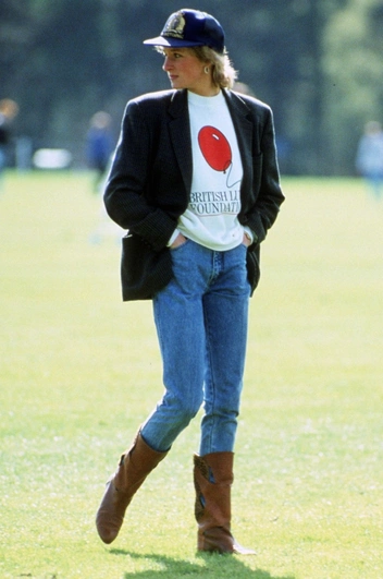 В этом историческом образе она мастерски продемонстрировала свой искусный подход к нарядам вне королевской службы, сочетая пиджак, толстовку, кепку, джинсы и ковбойские сапоги так, как это мало кому удастся. Этот ансамбль до сих пор находит отклик у дизайнеров и любителей моды и регулярно вдохновляет многих влиятельных лиц в Instagram (запрещенная в России экстремистская организация).