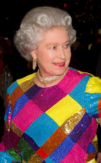 Все знают, что Ее Величество — королева цвета, но редко можно увидеть, чтобы она носила все оттенки сразу. Это произошло в 1999 году, когда Елизавета присутствовала на представлении Royal Variety и решила появиться в этом сказочном наряде, которое модные критики шутя окрестили платьем Арлекины.