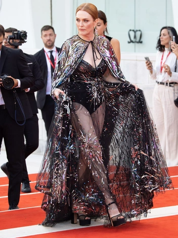 Церемония открытия Venice Film Festival состоялась 31 августа. Президент фестиваля блистала в полупрозрачном черном ансамбле Valentino с вышивкой в виде фейерверков. Джоди Тернер-Смит продемонстрировала лучшее от стиля 1980-х, дополнив эффектное платье Gucci со шлейфом с алой оборкой высокими зелеными перчатками с надетыми на мизинцы крупными кольцами и изумрудным колье. Тесса Томпсон щеголяла скульптурном черно-серебристом ансамбле Armani. Катрин Денев не изменила приверженности к Saint Laurent и любви к красному.