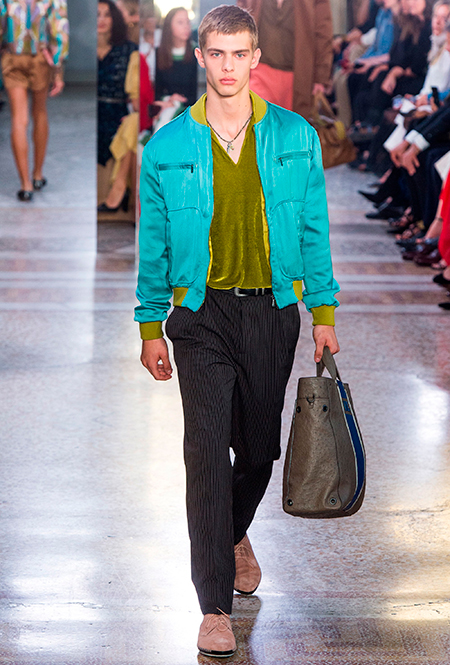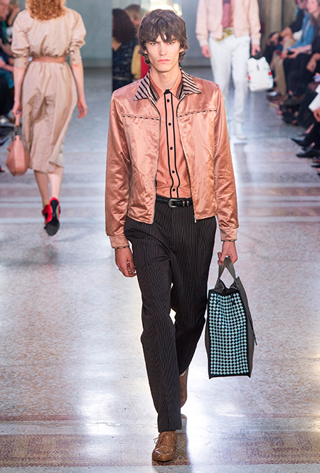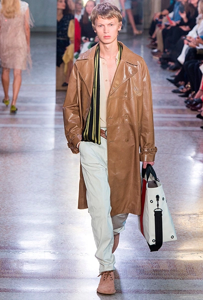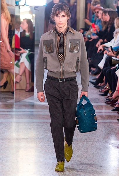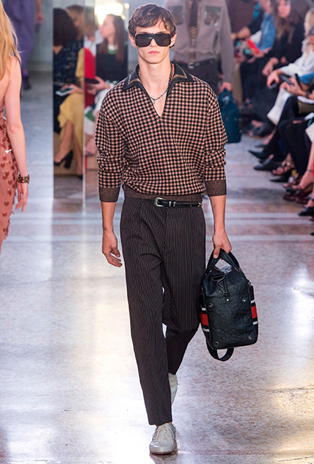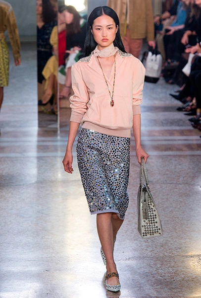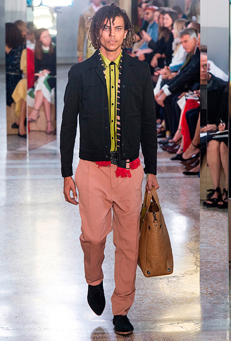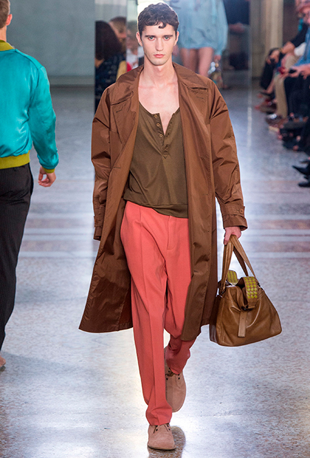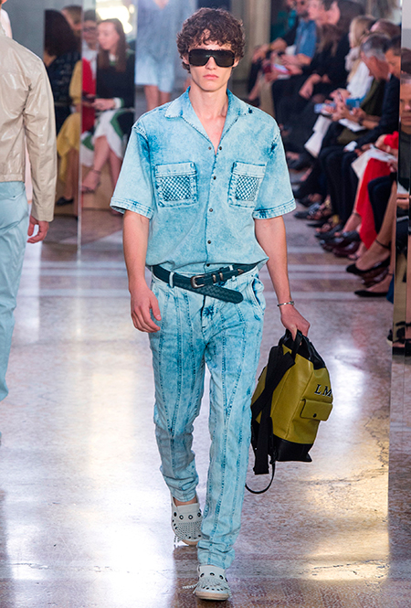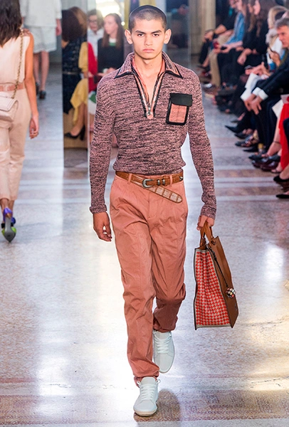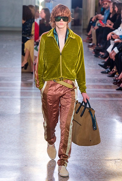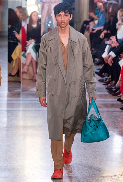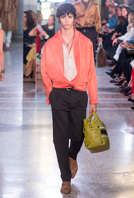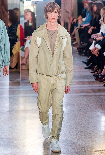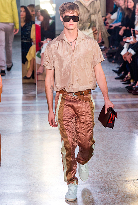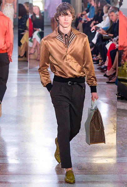 Как и у многих дизайнеров на миланской Неделе моды, блёсток, стразов и пайеток у Майера в этом сезоне много. Однако в его случае блестящие вещи выглядят не экстравагантными и не избыточными, а вполне себе casual, без отсылки к буйным 80-м. Такого эффекта он добивается, прежде всего, с помощью виртуозной работы с цветом. Оттенки здесь приглушённые, будто пропущенные через Instagram-фильтр (запрещенная в России экстремистская организация), который гасит их яркость, делая сложнее и интереснее. Деграде на некоторых вещах создаёт эффект потертости или «припыленном ты» ткани. Сочетает цвета Майер тоже мастерски, как в женских, так и в мужских образах: приглушённый розовый – с пепельно-лиловым, горчично-жёлтый – с «пыльным» коричневым. Различий по гендеру дизайнер не делает. Цвета одинаково хороши как «для него», так и «для неё».