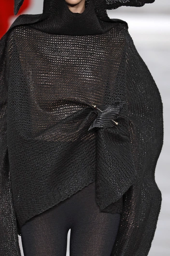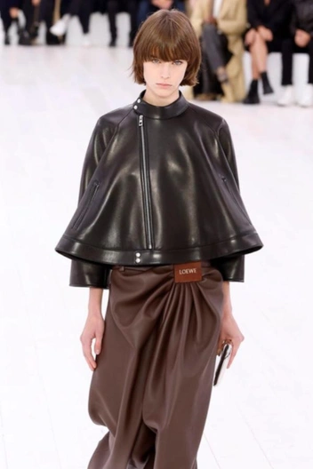 На показе Loewe осень-зима 2025 мы увидели прием, в котором ткань присобрана к верху и заколота с помощью логотипа бренда. Этот стайлинг быстро разлетелся по сети и стал популярен, но не у всех есть возможность купить юбку или брюки со сборкой от бренда за более чем тысячу долларов. Тогда мы придумали другой способ быть в тренде — собрать ткань, и заколоть ее брошью. В ближайший сезон проделываем трюк со свитерами и юбками из летящей ткани.