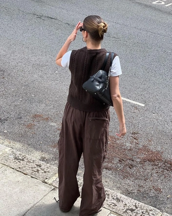 Брюки карго будут стильно смотреться с любимыми трикотажными вещами, Кардиган по фигуре в комбинации с обувью на каблуке сделает образ более женственным, а объемный свитер и oversize-жилет в компании ботинок на шнуровке или кроссовок — повседневным и комфортным.