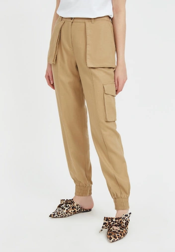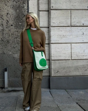 Коллекции весна-лето 2023 вторят осенне-зимним трендам, а потому можно с уверенностью заявить, что брюки карго останутся в нашем гардеробе и через полгода. Выбирайте модели из плотной ткани, которые хорошо держат форму. Так образ выглядит более дорого и стильно. Эффектные луки получатся, если добавить к наряду жакет с мужского плеча или объемное пальто и обувь на каблуке (читайте также: Подходит всем: 5 моделей осенней обуви на каблуке, в которой можно ходить хоть целый день).