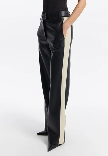 Качественные прямые брюки из экокожи созданы для тех девушек, которые предпочитают более узкие варианты поясных изделий и не любят оверсайз штанины. Такие фасоны никогда не выйдут из моды — это покупка на много лет вперед. Сегодня не требуется обязательного микса прямого низа и объемного верха, поэтому модель можно сочетать даже с водолазкой или лонгсливом. Обувь подойдет как на плоском ходу, так и на каблуке.