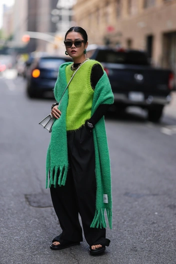 Костюм, безусловно, подойдет тем, кто так и не оценил оверсайз низы. Это не суперширокие брюки палаццо, тем не менее они удачно вписываются в современные тренды. Важно, чтобы такие модели не слишком плотно облегали бедра. Трикотажный костюм можно надеть с любой обувью — как на каблуке, так и на плоском ходу. При стилизации с каблуком штанины должны быть не выше двух сантиметров от пола. Носить эти вещи рекомендуется именно комплектом, поскольку они отлично работают совместно.