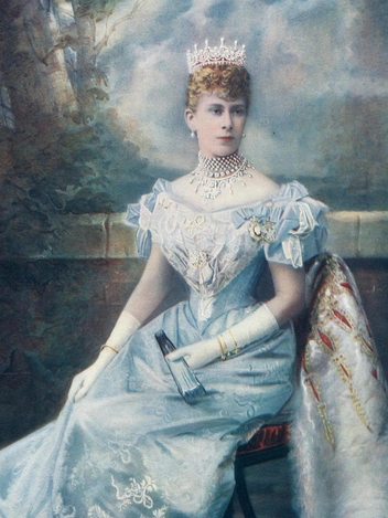 Вильгельм IV заказал это ожерелье с бриллиантовой «бахромой» для своей жены Аделаиды в 1831 году. Ее изготовили с использованием камней, которые когда-то принадлежали его отцу, королю Георгу III. Кзатем украшение перешло к королеве Виктории, которая переделала его, чтобы его можно было носить как тиару. Мария предпочитала носить диадему на голове, о чем свидетельствует этот портрет 1913 года, однако шесть лет спустя она, по-видимому, устала от Adelaide Fringe и сделала себе собственную тиару с «бахромой».