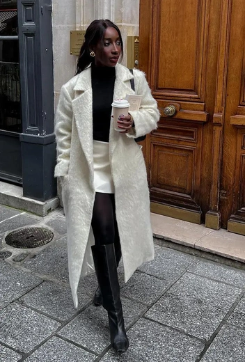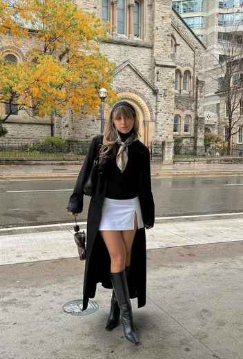 Водолазка + мини-юбка + высокие сапоги — классика европейского зимнего образа, которая с утепленными колготками идеально впишется и в наши погодные условия.